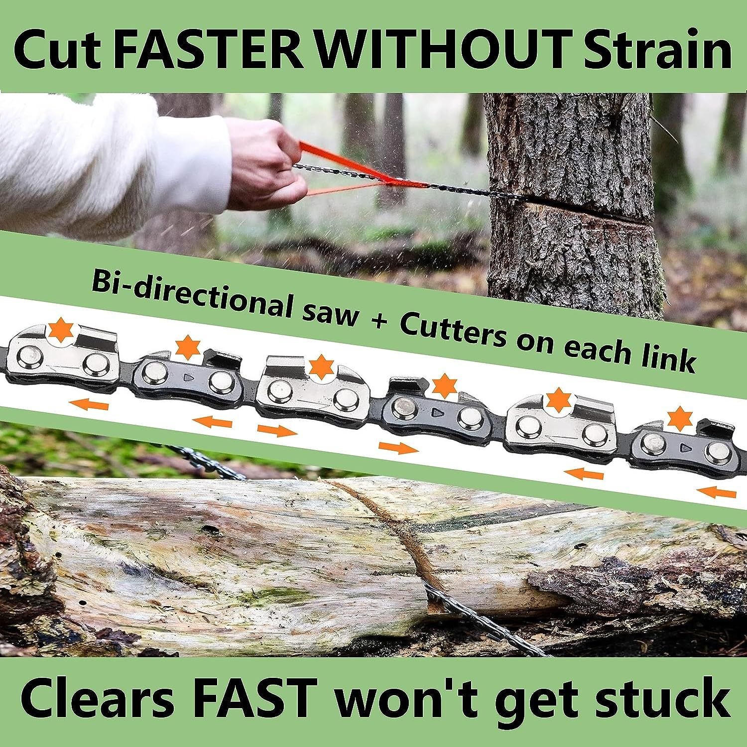 5. Fast Cutting: The hand saw chain has a sharp and efficient cutting edge that can remain sharp for long periods, making it ideal for chopping wood in survival situations and outdoor adventures.